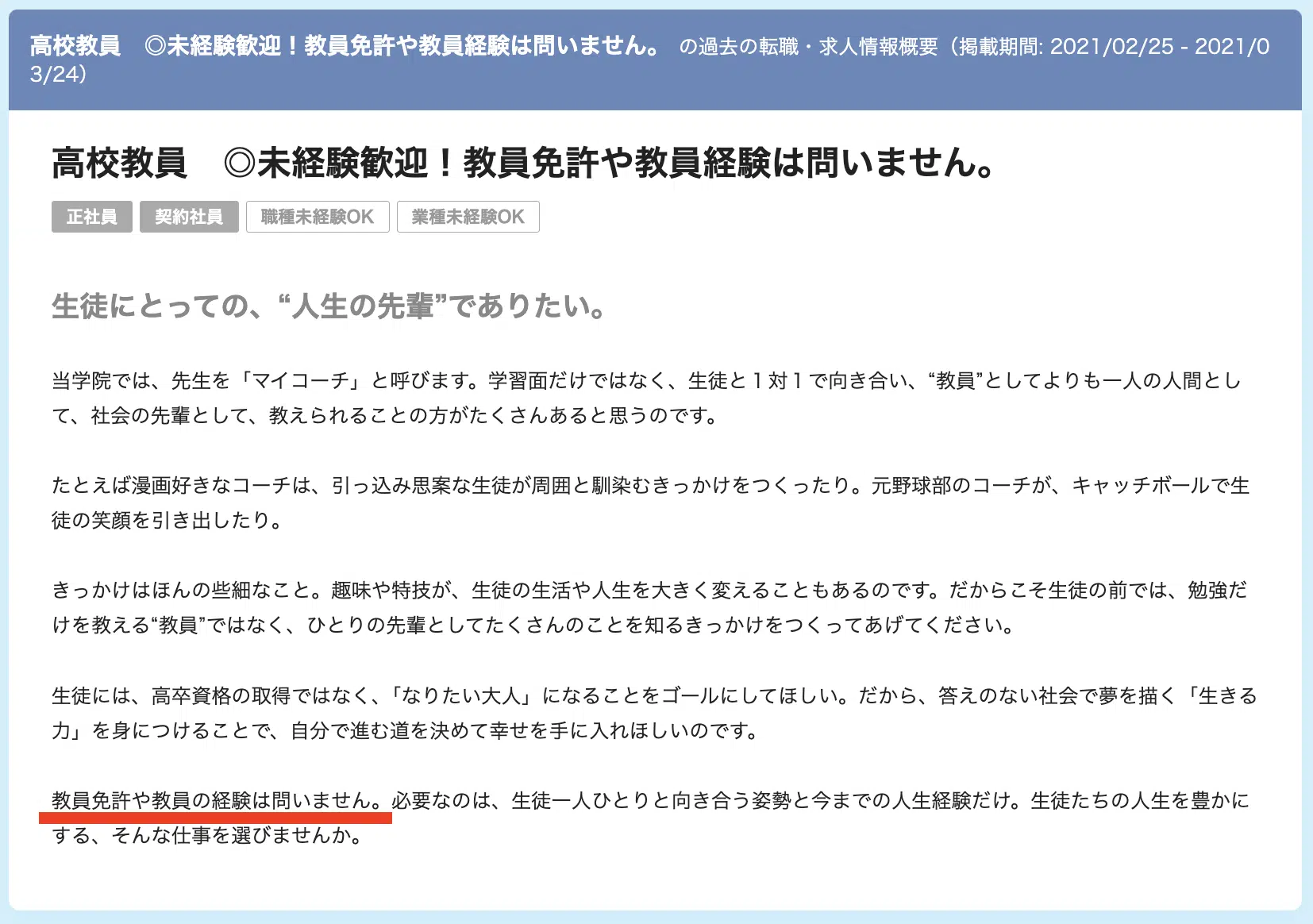 下記は「エン転職」に掲載されているおおぞら高等学院の教員募集ですが、募集内容にもその旨が記載されています。