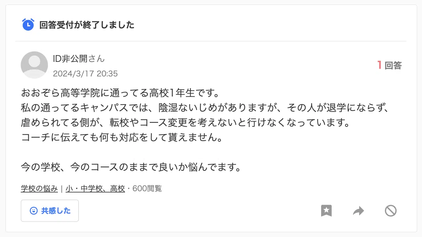 おおぞら高等学院で検索すると「炎上」というキーワードが表示されるので、気になる方もいると思います。