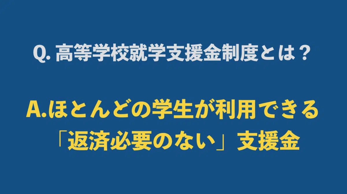 この制度は家計に重くのしかかる学費の経済的負担を減らし、お金がなくて高校に行けない生徒を一人でも減らすことを目的とした制度です。