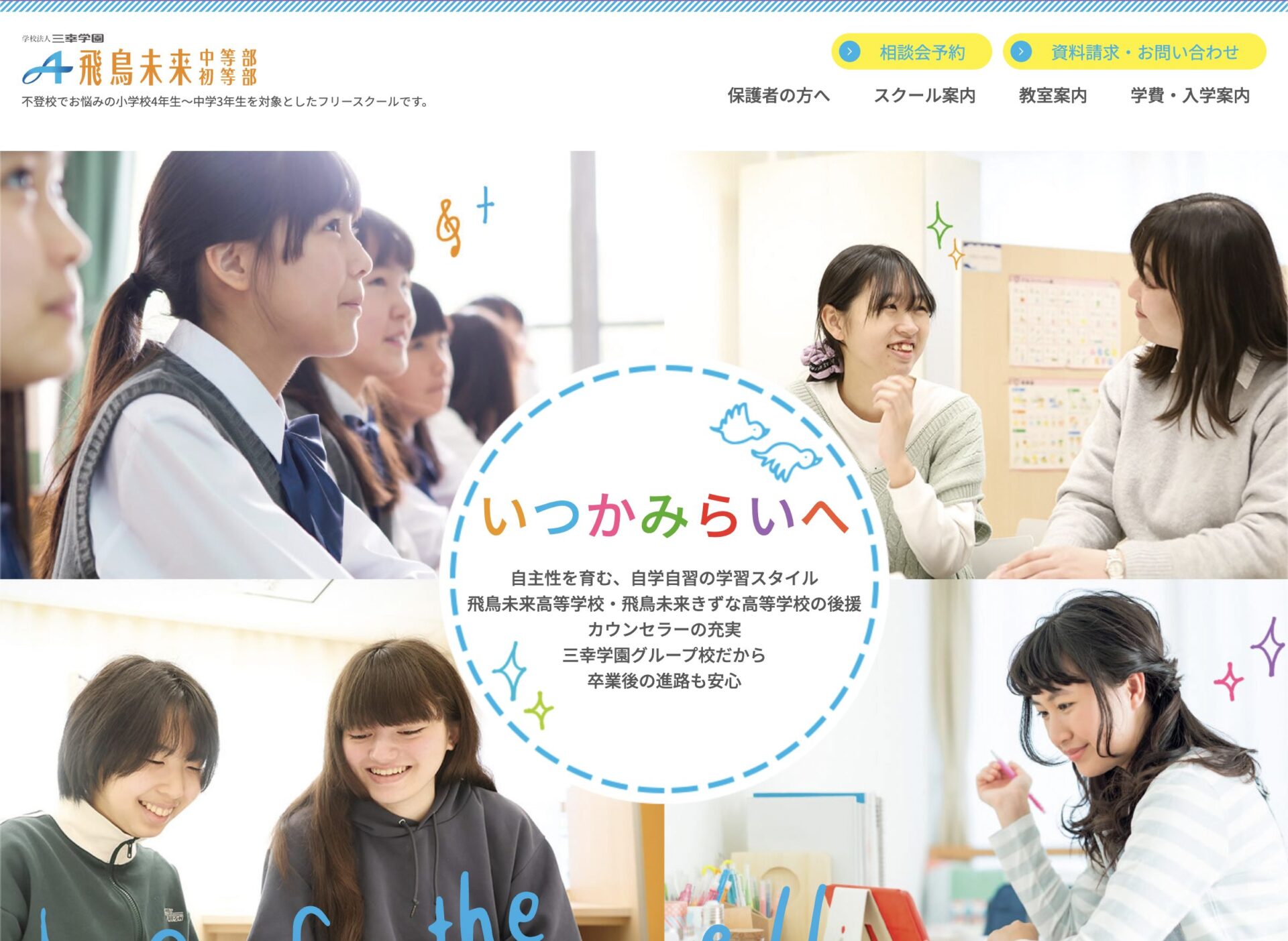 飛鳥未来中等部は、通信制高校「飛鳥未来高等学校」「飛鳥未来きずな高等学校」などを運営する学校法人三幸学園が母体のフリースクールです。