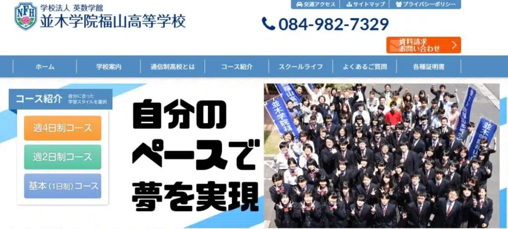 並木学院福山高等学校は、福山市吉津町にある私立の通信制高校です。各線福山駅から歩いて約15分の距離にあります。