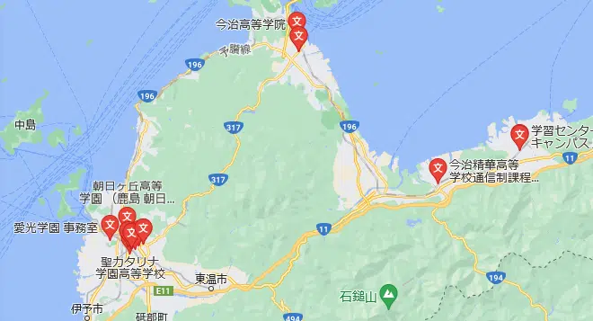 | 鹿島山北高等学校 | 朝日ヶ丘高等学園 | 愛媛県松山市大手町1丁目7-4 伊予鉄大手町ビル1F |