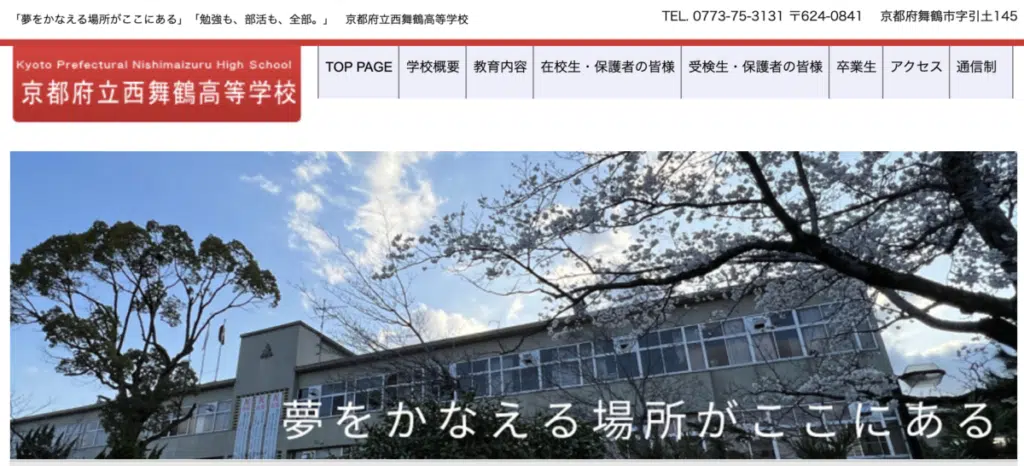 京都府立西舞鶴高等学校は昭和23年創立の昔からこの地にある高等学校です。令和4年度の情報ですが、132人の生徒がこちらの西舞鶴高等学校通信制で学んでいます。