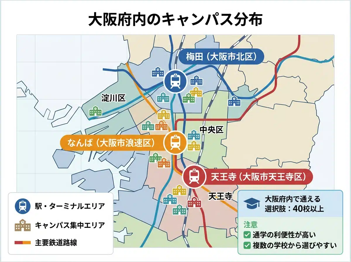 ・キャンパスが多いエリア:大阪市中央区、大阪市北区(梅田)、大阪市淀川区、大阪市浪速区(なんば)、大阪市天王寺区