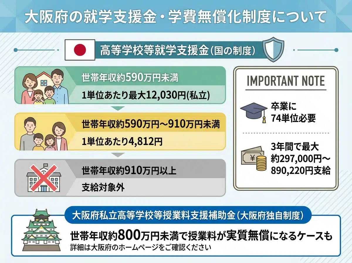 大阪府の通信制高校は「高等学校就学支援金制度」の対象となり、所得要件を満たす世帯(年収910万円未満の世帯)の生徒に対し、授業料が支給されます。公立校の授業料は無料、私立校は世帯年収590万円未満であれば授業料無料、世帯年収910万円未満の家庭は年間118,800円まで支給されます。