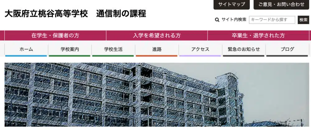 大阪府立桃谷高等学校は、大阪府内唯一の公立通信制高校です。通信制のため毎日通学する事がないので、自分のペースで学校に通えます。校舎は大阪府大阪市にあり、最寄り駅は桃谷駅。通信制とは別に、定時制課程も併設されています。