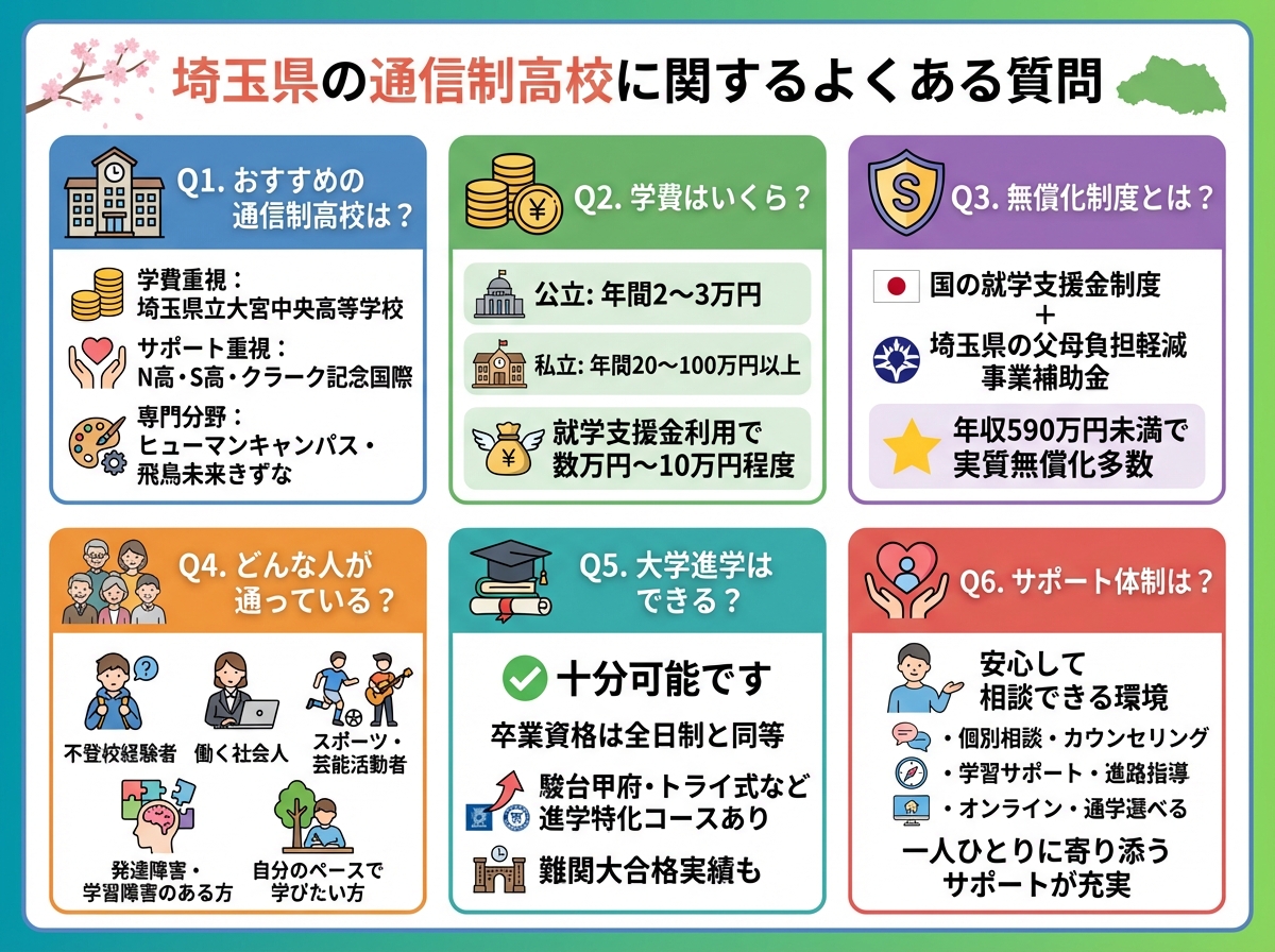 この記事では、埼玉県内で通える通信制高校・サポート校について、主に学費が安くておすすめな学校情報をまとめています。