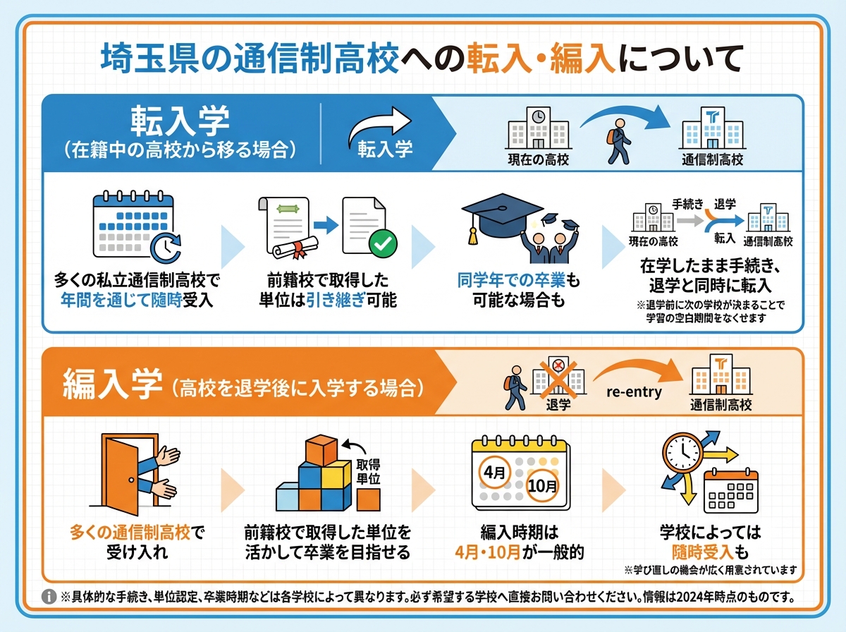 単位認定の基準は学校により異なるため、事前に確認が必要です。また、転入時期によっては年度内卒業ができない場合もあります。公立の大宮中央高校は転入・編入の受付時期が限られていますが、私立は随時受付の学校が多いです。まずは興味のある学校に相談してみましょう。