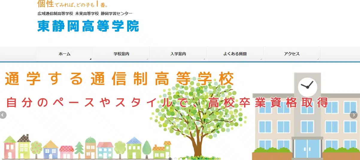 県内の公立通信制高校は「静岡県立静岡中央高等学校」1校のみです。住所は、静岡県静岡市葵区城北2-29-1。学費が非常に安いのが特徴で、年間学費2-3万円程度。スクーリングは週に1回で、日曜日か月曜日、火曜日のいずれかに行われます。