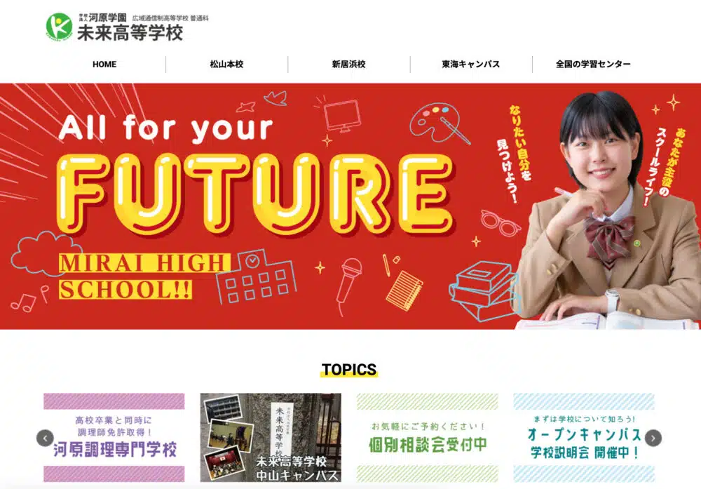 未来高等学校は2007年に愛媛県松山市に開校した、広域通信制私立高校です。通学がメインのコースから、自宅学習中心で通学回数をごく限られた回数にしている通信コースなど、生徒の希望に合わせた通学方法を選ぶことができるのが特徴です。