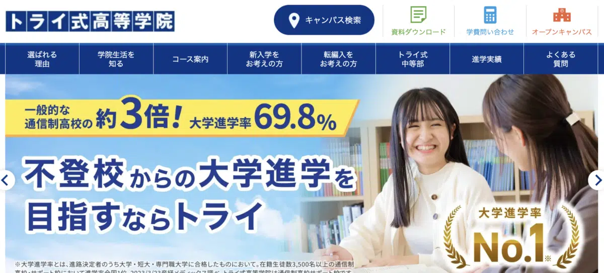 トライ式高等学院は、家庭教師のトライが母体の通信制サポート校。マンツーマンの手厚い指導が特徴で、