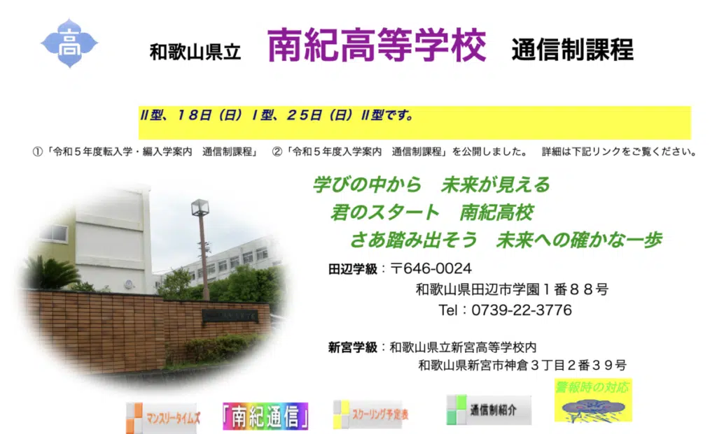 和歌山県立南紀高等学校は、和歌山県田辺市にある公立の通信制高校です。定時制高校も併設されています。自宅から本校までの距離が遠い人のために、新宮市に協力校が1校あります。週1回のスクーリングとレポート作成を提出し、テストを受ければ単位を取得できます。卒業には、30時間以上の特別活動への参加も必須です。