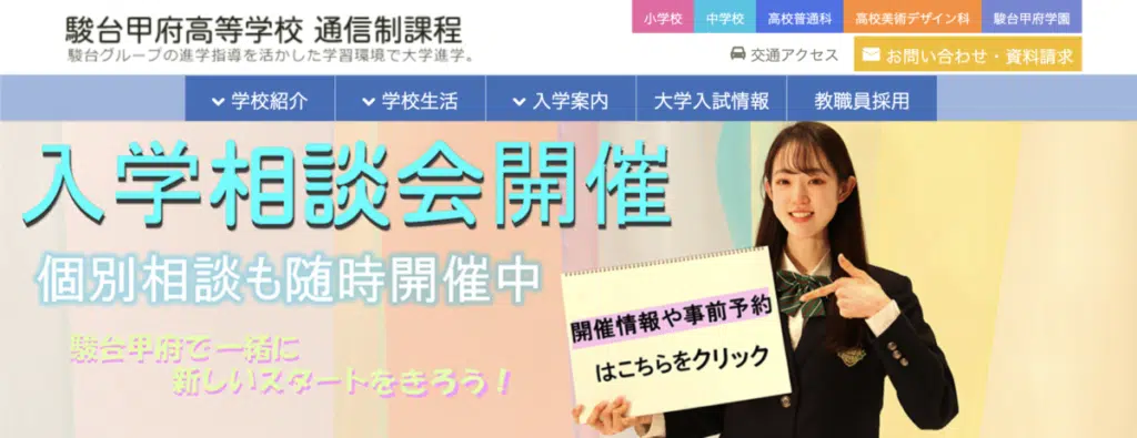 駿台甲府高等学校は、予備校で有名な「駿台」が開設した高校の通信制課程です。予備校が運営母体の通信制ということもあり、「大学や短大、専門学校へ進みたい」という、進学を目的とした生徒が集まる傾向があります。