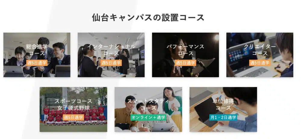 | 通学コース | 総合進学コース(進路・探求系) 総合進学コース(パフォーマンス系) 総合進学コース(クリエイター系) スポーツコース 女子硬式野球 スマートスタディコース 単位取得コース |