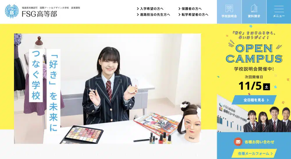 FSG高等部は、福島県知事認可の高等専修学校として、専門スキルを高校生のうちから学べる貴重な学校です。10コースから自分の興味に合った分野を選び、業界のプロから直接指導を受けられるのが最大の魅力です。
