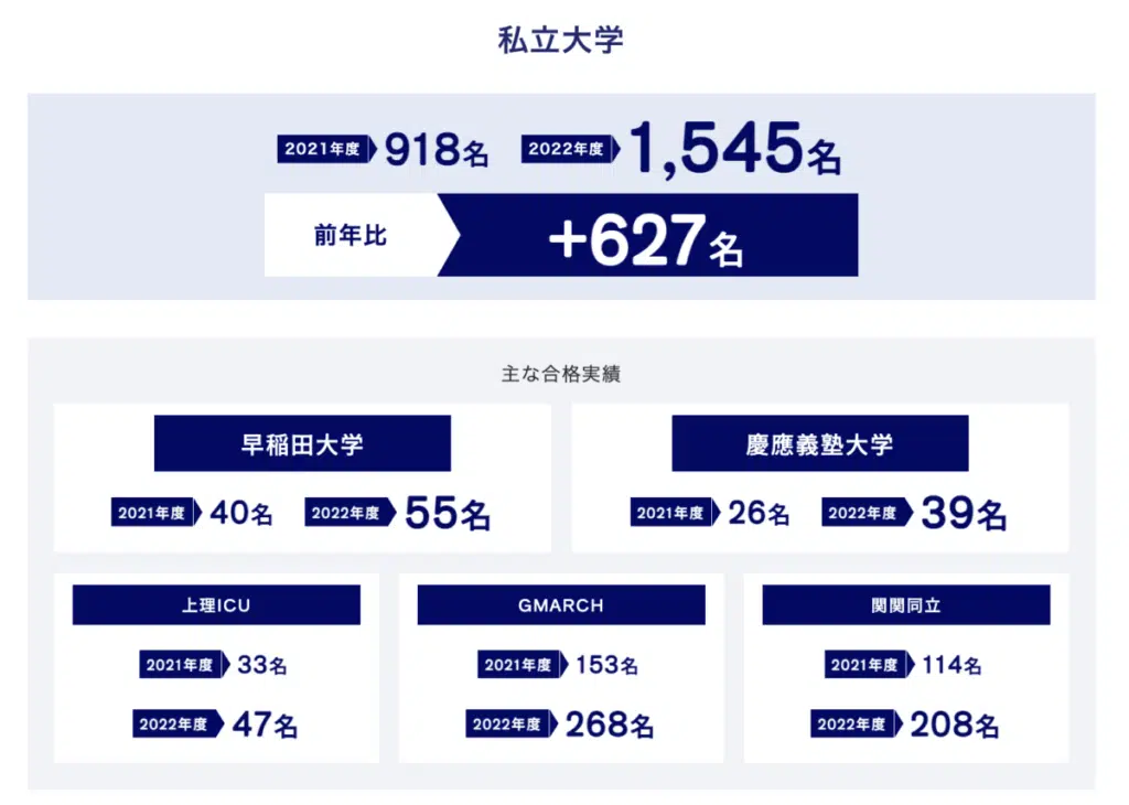 さらには京大・一橋・阪大・北大など名だたる名門校へも1名ずつの合格者が輩出されました。2021年度にも1名、2022年度には2名(うち現役合格は1名)の東大合格者が出ています。2020年度に56名だった国公立大学合格者が、2022年度には113名まで増えているのです。