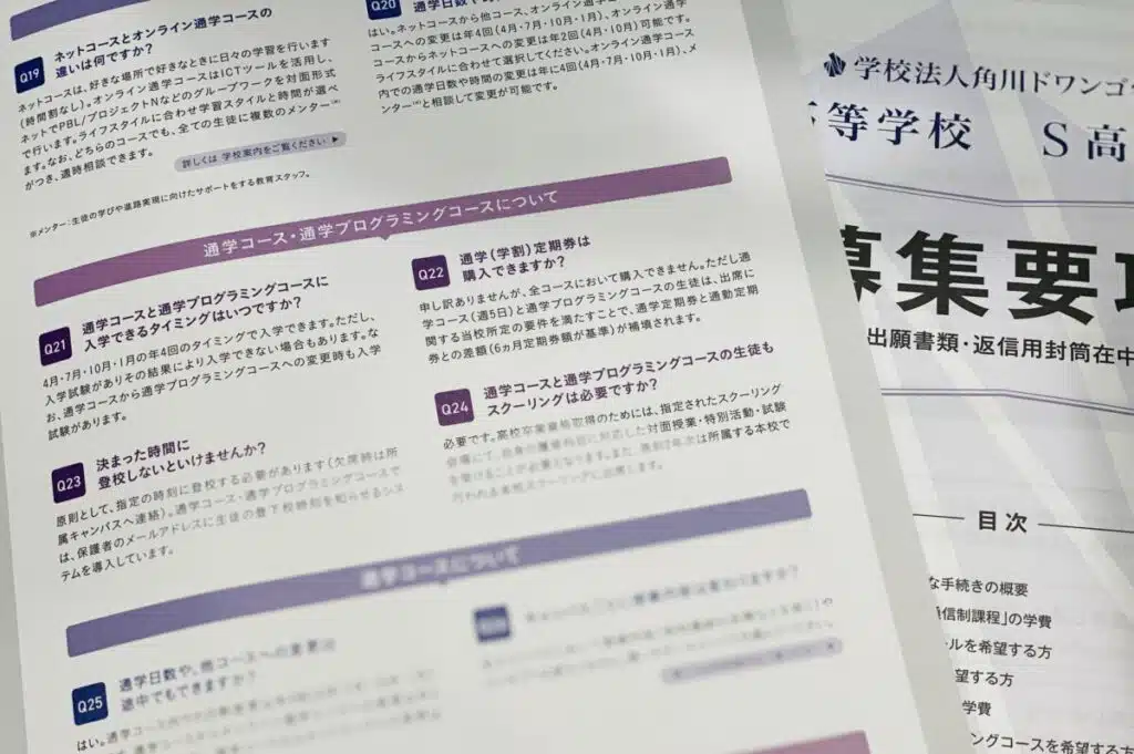 こちらは2023年度の募集要項の写真ですが、募集要項を取り寄せると、N高校に寄せられるよくあるQ&Aがまとまった冊子や、詳細な学費説明、入試の流れをわかりやすく把握できます。