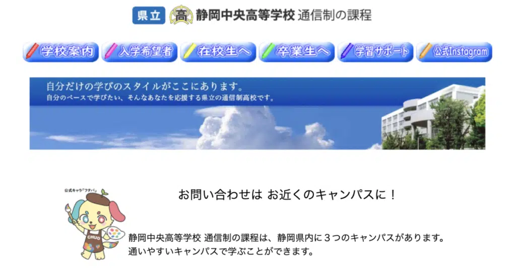 静岡中央高等学校は、静岡県立の通信制の高等学校です。西部(湖西市)、中部(静岡市)、東部(三島市)の3か所にキャンパスを持ち、最寄のキャンパスでスクーリングを受けることが出来ます。