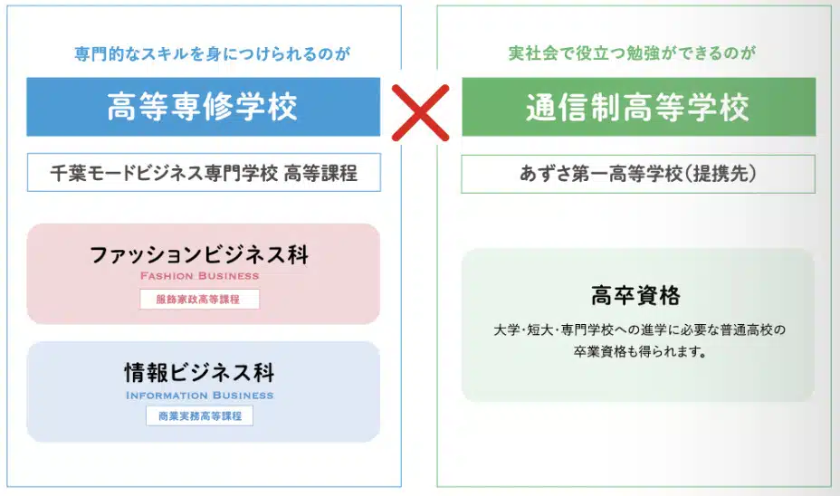 千葉モードビジネス専門学校 高等課程には「ファッションビジネス科」と「情報ビジネス科」の2つのコースが設けられています。